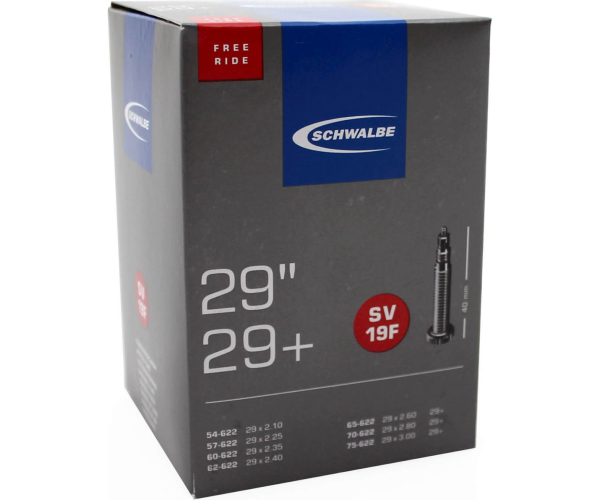 Schwalbe binnenband Freeride 28x1.75 Frans - SV19F/65-584, 70-584, 75-584, 54-622, 57-622, 60-622, 62-622, 65-622, 70-622, 75-622. De Schwalbe binnenbanden zijn betrouwbaar. Fietsdetaillisten waarderen hem om zijn hoge betrouwbaarheid. Iedere band wordt in de fabriek opgepompt en zo 24 uur op luchtdichtheid getest. De band houdt de luchtdruk langer vast. In de productie vereist Schwalbe een zeer hoog butyl aandeel en een zeer hoge reinheid van het materiaal. Zo houdt de Schwalbe binnenband de luchtdruk beduidend langer vast dan andere binnenbanden. Het is een groepen-binnenbandsysteem: Een Schwalbe binnenband is extreem elastisch en past op meerdere bandafmetingen. Hierdoor worden ze groepen binnenbanden genoemd. Zo past bijvoorbeeld de binnenband met nummer 19A voor bandafmeting van 27.5 inch tot 29 Inch en voor de breedte van 40 tot 62mm. Als laatste is de band 100% volledig recyclebaar. Freeride-uitvoering: Groot volume, gering gewicht.